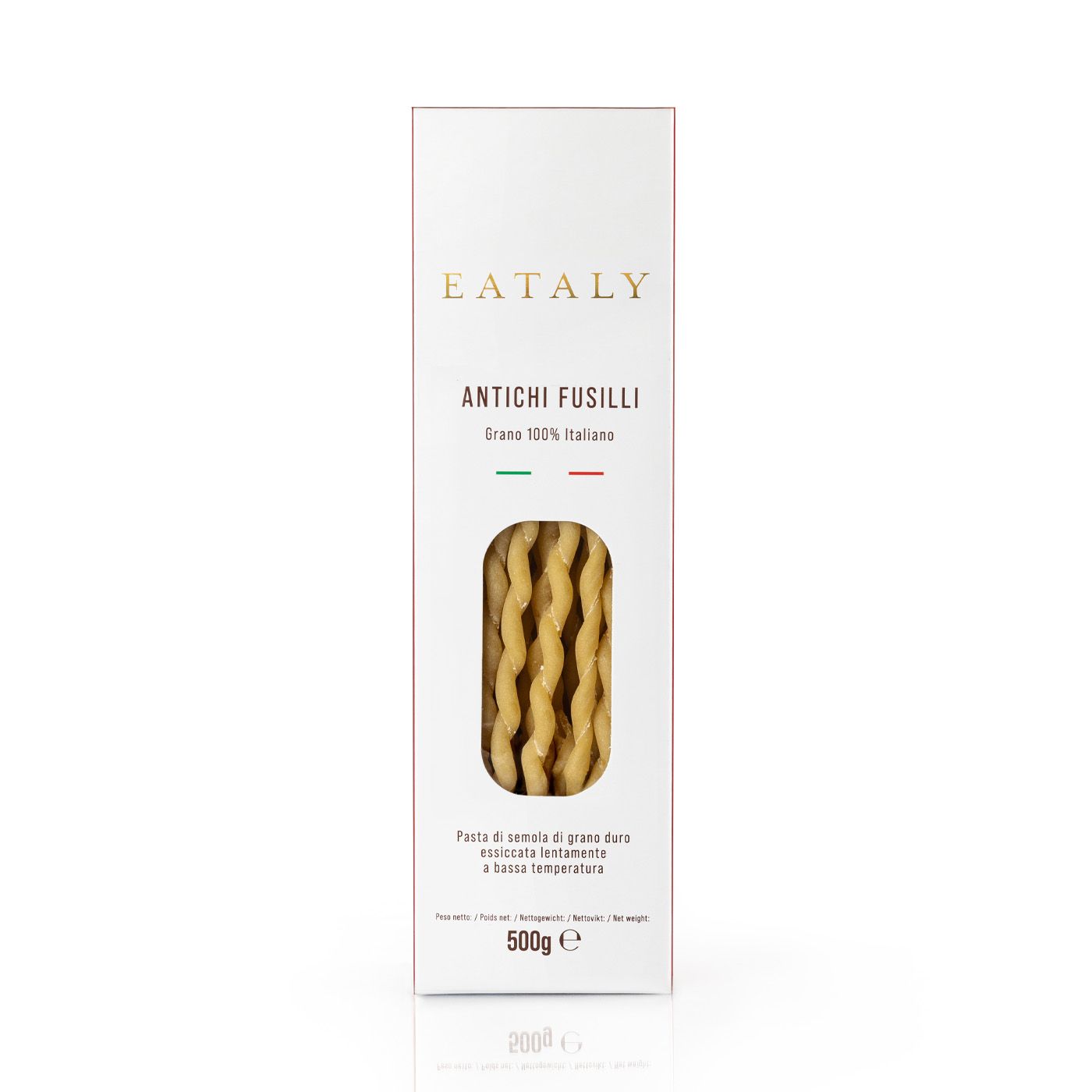 Antichi Fusilli 100% Italian Wheat is the ideal first course for lovers of Italian tradition and authentic flavours.Produced with simple and carefully selected ingredients (water and durum wheat semolina), then processed using artisanal methods to offer superior quality and an inimitable taste. Their very particular elongated shape and porous consistency makes them perfect with various condiments.Excellent with a simple tomato and basil sauce or with more elaborate preparations based on fish or vegetables, Eataly’s Antichi Fusilli will satisfy even the most demanding palates.