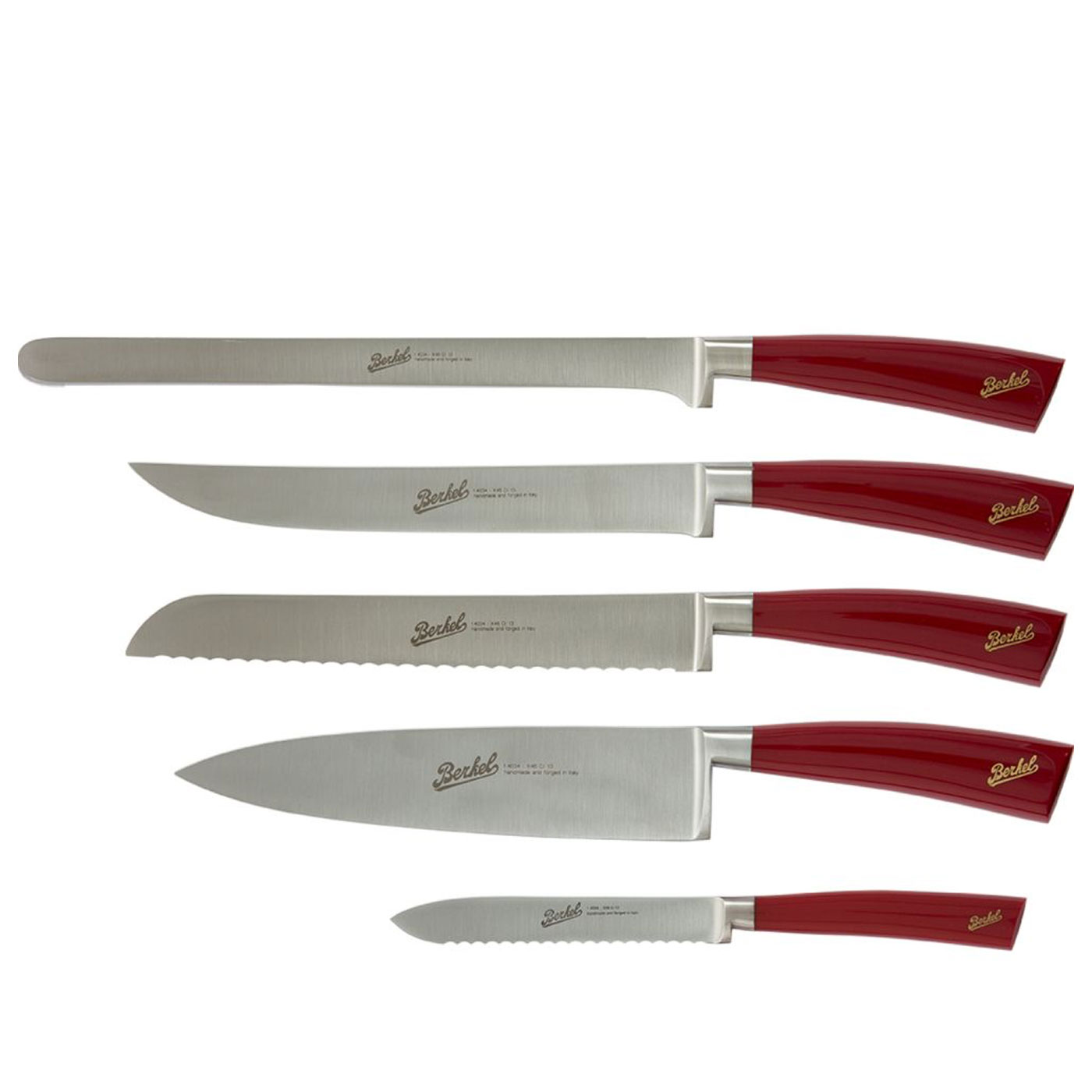 Elegance Chef – Set of 5 Red Knives by Berkel is a set of five practical knives ideal for slicing a whole leg of delicious Italian ham and some freshly baked bread, or carving a roast. The