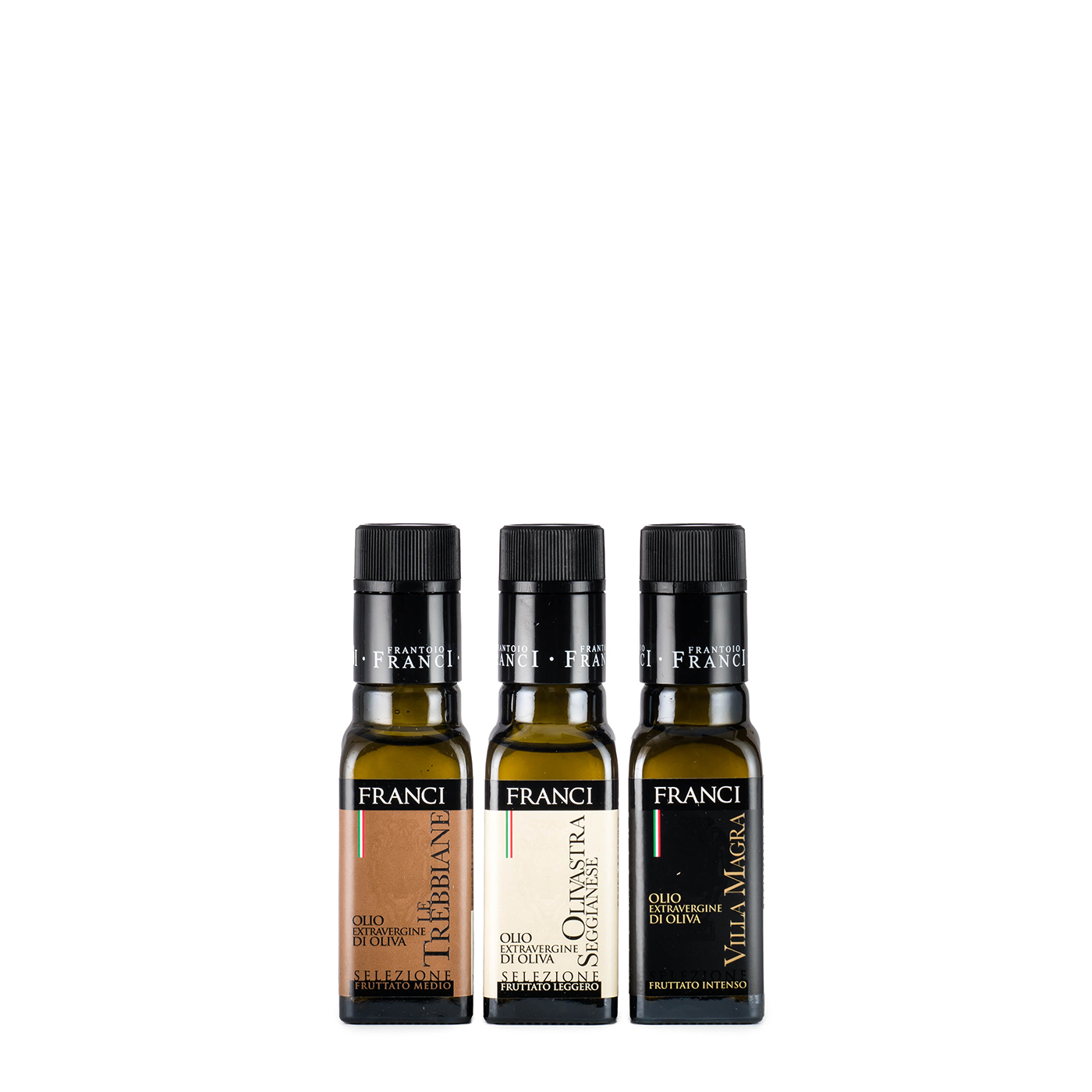 Villa Magra: harmonic, rich in herbaceous notes, artichokes and a balanced spicy-bitter ending.Olivastra Seggianese is a light fruit monovarietal oil made from the ancient Olivastra Seggianese olive trees, unique to the Amiata Mountain region of southern Tuscany.Le Trebbiane is a blend of 40% Frantoio, 10% Moraiolo, 40%Leccino, and 10% Olivastra cultivars, giving it a broad flavor, rich in grassy scents, with hints of artichoke and tomato, without being too peppery. The olives are hand-picked from the east-facing olive grove of the same name.Villa Magra is the name of the flagship oil produced by Frantoio Franci, as the first oil that the family produced bore this name. A name derived from the centuries’ old olive grove devastated by the 1985 winter freeze. Replanted in 1987, it lies on the north/north-eastern slopes of Montenero d’Orcia. The villa magra has vegetal notes of thistle and lettuce and aromatic notes of mint, rosemary, and pepper.