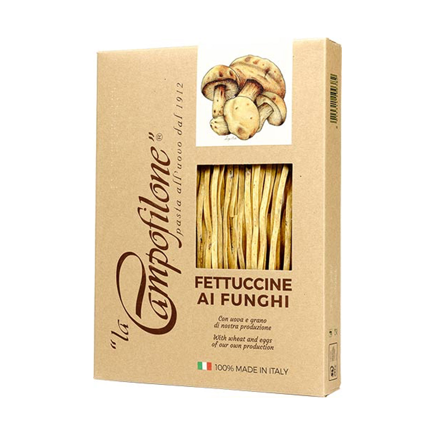 To make Fettuccine, artisans roll long strands of egg dough, then slow dry the pasta at low temperatures. The addition of mushrooms gives the fettucine an irresistible aroma.