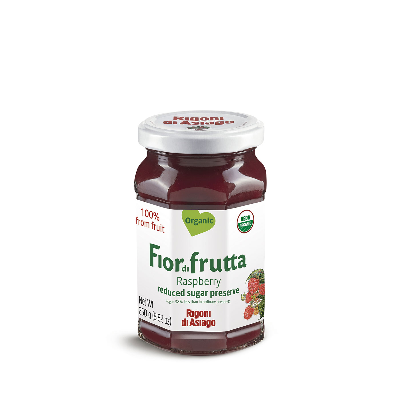 This Raspberry Jam from the “Fiordifrutta” line is made exclusively from select organic raspberries and using a low-temperature cooking process. Rigoni Fiordifrutta jams do not contain any added sugar, but use only organic wild apple juice as a sweetener. Most raspberries are harvested in the mountainous areas in July and August. They are flavorful, sweet fruits, with a bright red color.