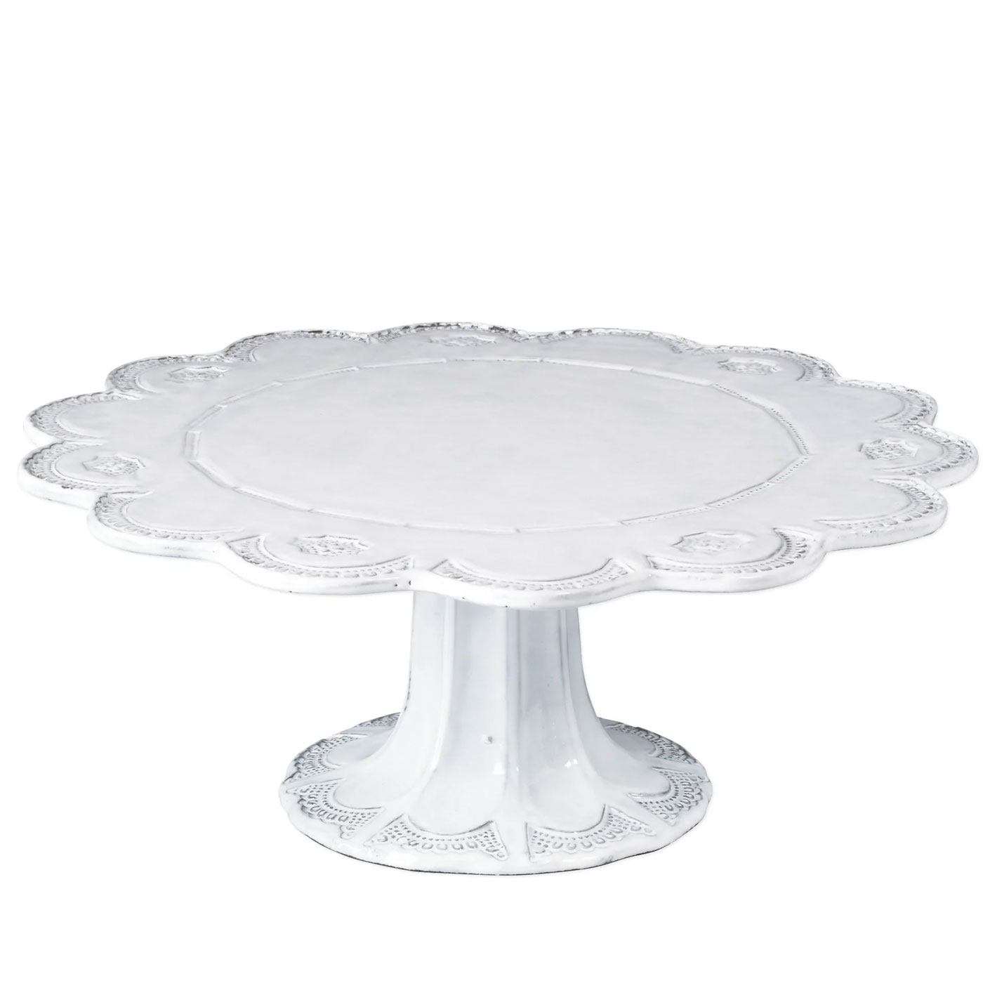 Incanto, (meaning enchantment), Vietri’s baroque dinnerware collection inspired by the architectural designs of 17th century Europe. Made with terra marrone clay and finished in a beautiful white glaze, this cake stand is stunning serving piece that doubles as artwork in your home.