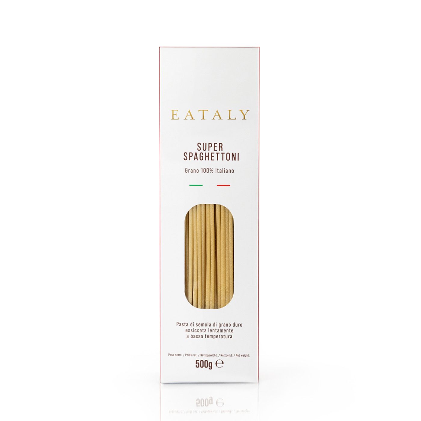 Super Spaghettoni 100% Italian Wheat from Eataly: unique format and artisanal manufacturing for this unmistakable tasty pasta.Produced with the best ingredients, processed without haste and respecting tradition, allows us to obtain a pleasant consistency on the palate and excellent stability during cooking. The dough is in fact made only with water and 100% Italian durum wheat semolina, then it is bronze drawn and dried at low temperature to guarantee a superior quality product.Rough, porous and consistent, Super Spaghettoni is perfect to combine with seared tomato, garlic and chilli pepper, or with a classic amatriciana sauce.