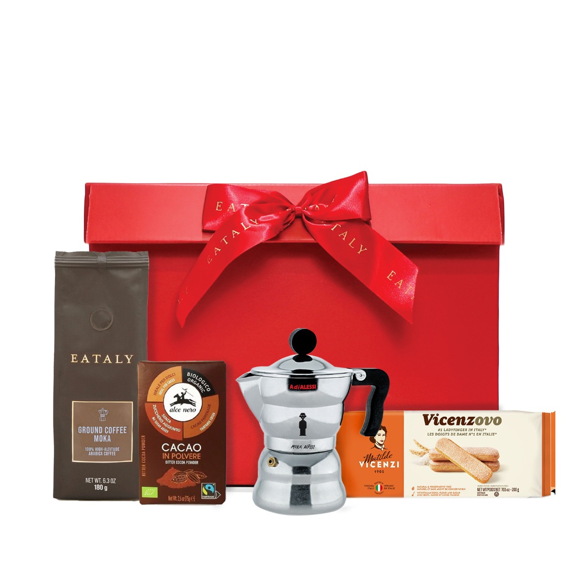 Tiramisu Delights gift box. This indulgent bundle includes crisp Italian ladyfingers, rich cocoa powder, 100% Arabica Moka ground coffee, and the iconic 3-cup Moka Alessi Espresso Coffee Maker. Whether you’re recreating the classic tiramisu or savoring espresso on its own, each item delivers a truly authentic taste of Italy. Perfect for food lovers, bakers, and coffee enthusiasts alike.