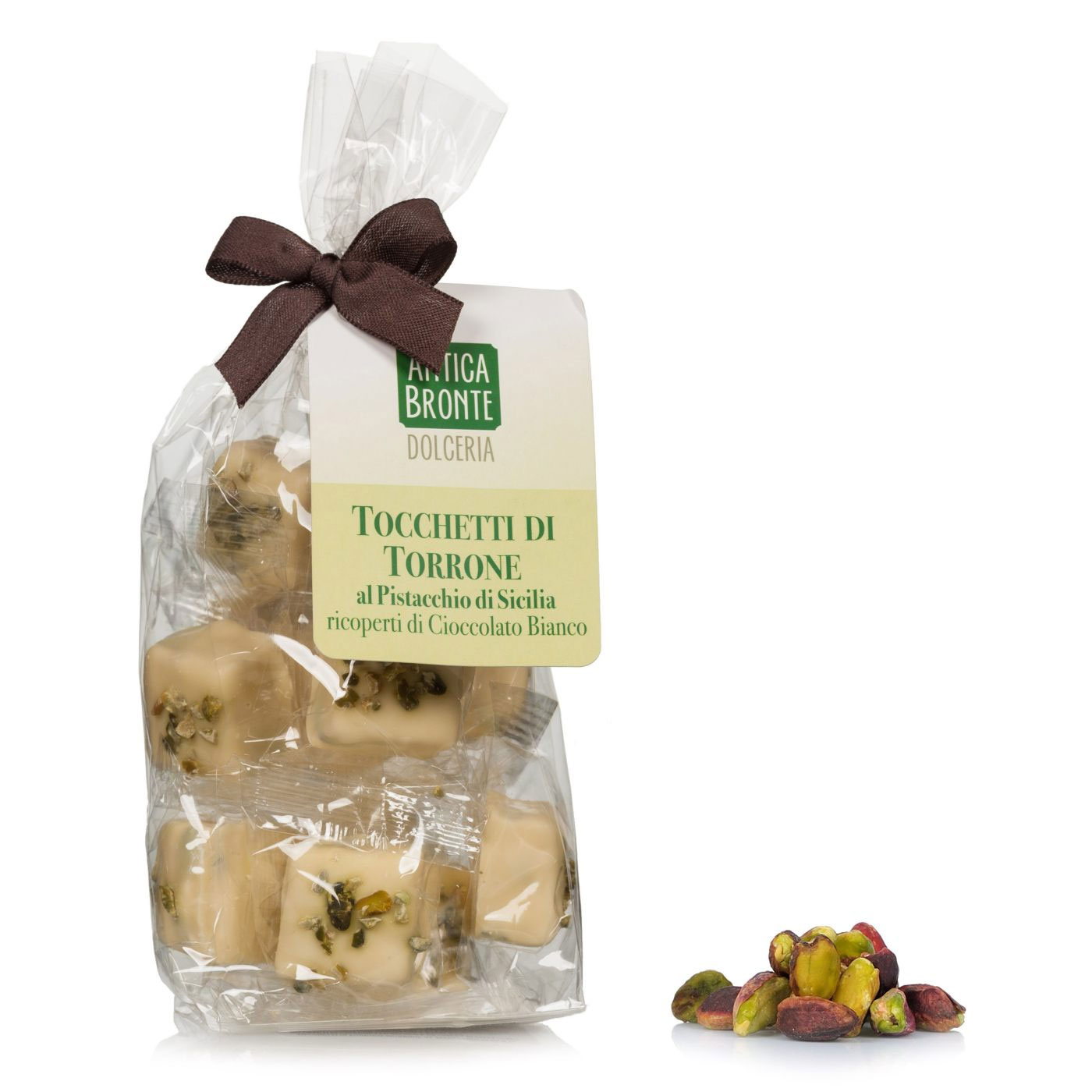 These Pistachio Tocchetti are bites of white chocolate-covered torrone, a traditional Italian nougat made with pistachios from Bronte and to be enjoyed during the holidays.